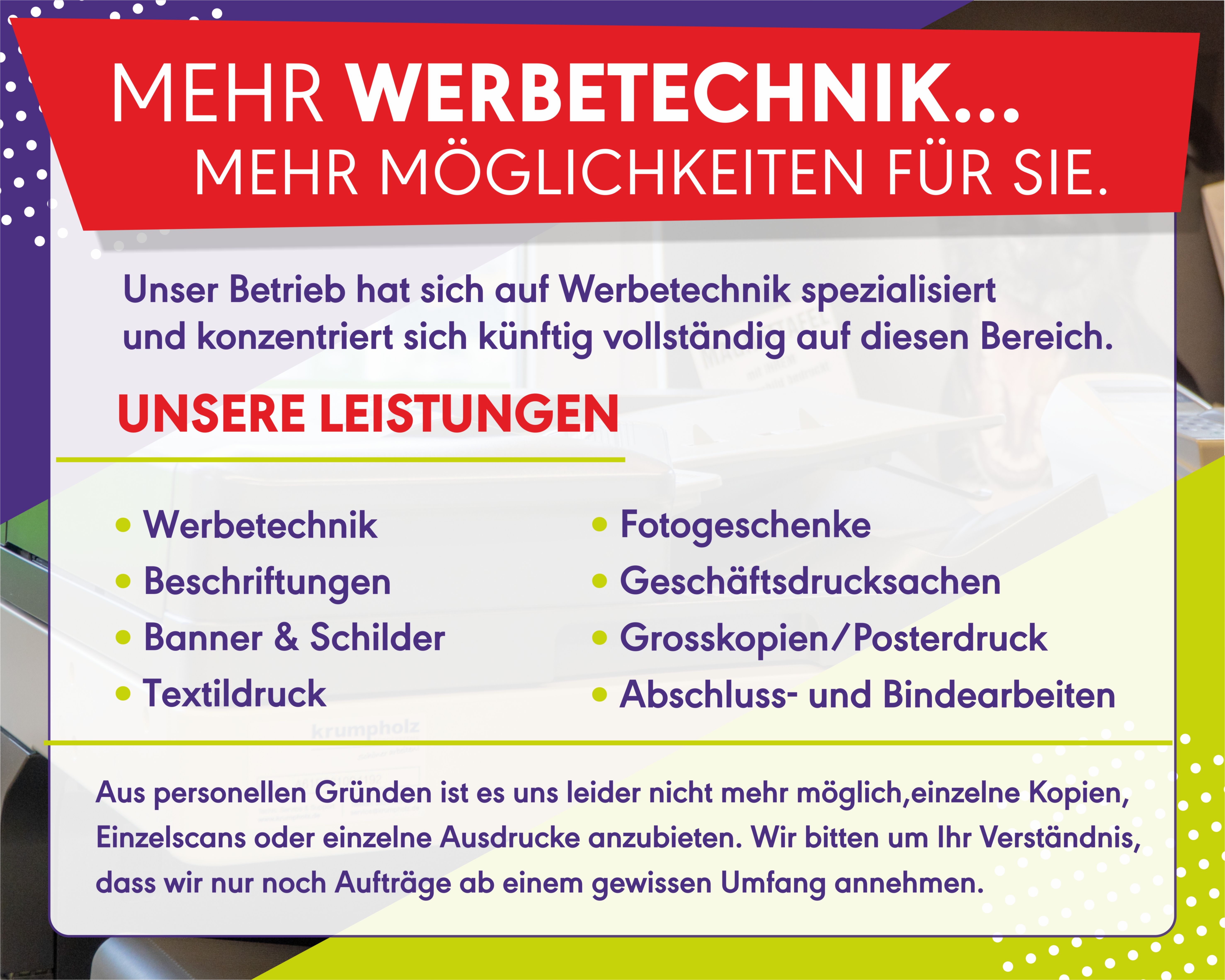 Natürlich können Sie auch einfach nur Fotos und Texte kopieren lassen, Bachelor-Arbeiten drucken und binden oder sich individuelle Stempel erstellen lassen.